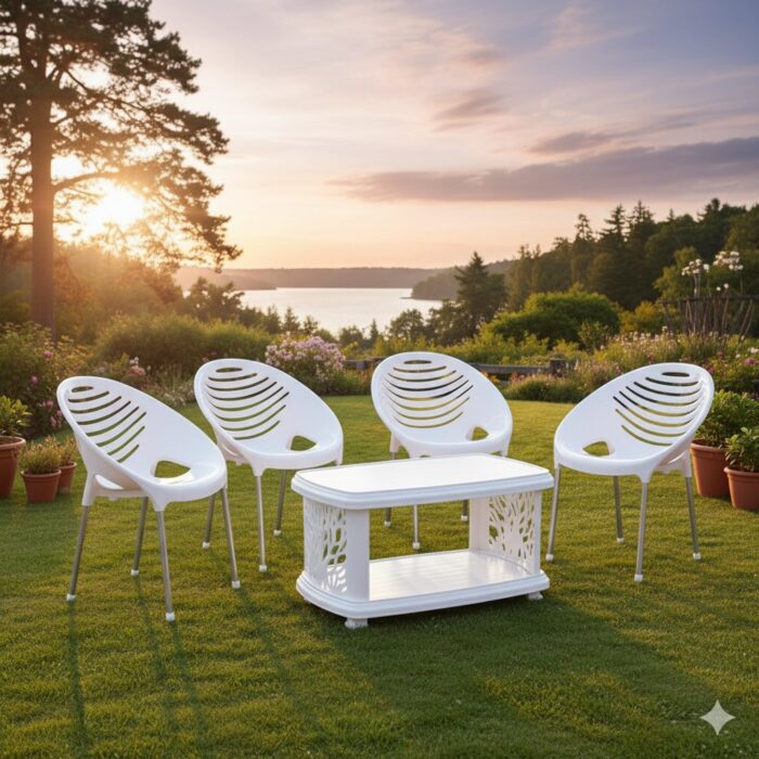 Wello by Boss Set of 6 Mega Jhony wp-317 Plastic Garden indoor and outdoor chair Chairs & 1 double shelf Cross shape plastic table